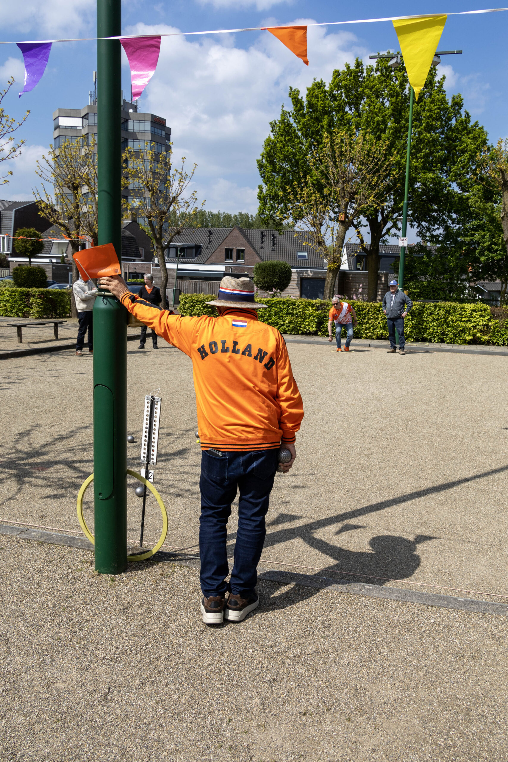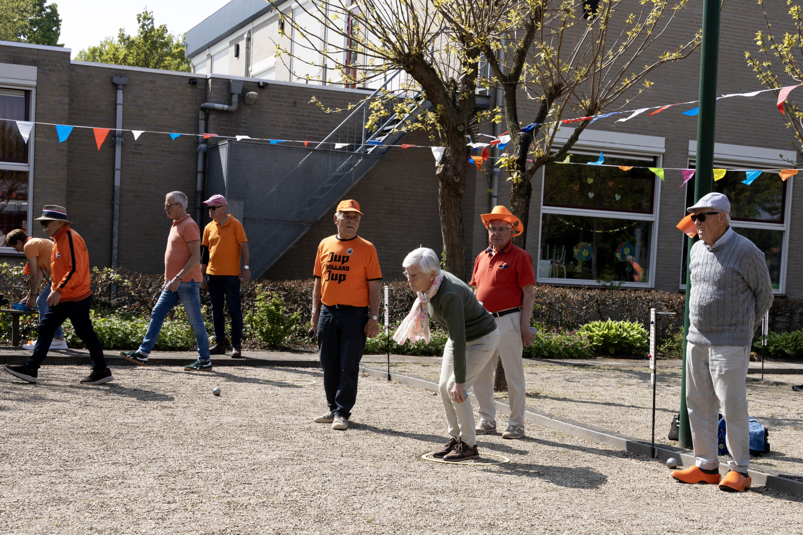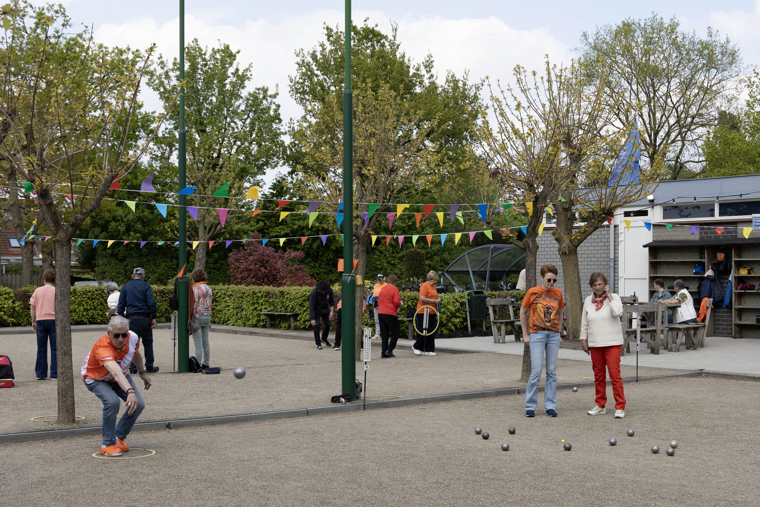 De boulebanen waren vrolijk uitgedost met kleurrijke vlaggetjes, wat zorgde voor een extra feestelijke sfeer.